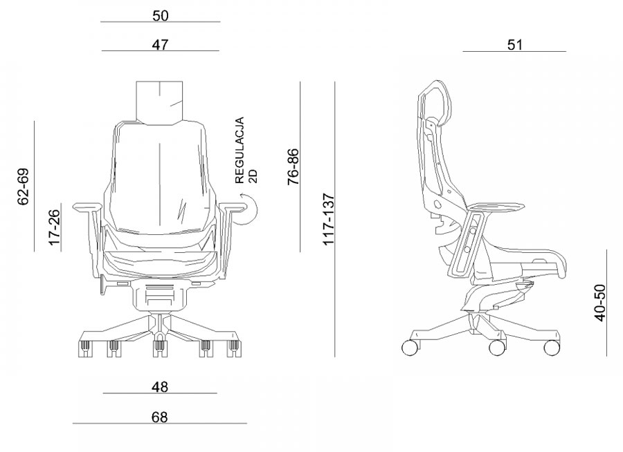 Podłokietniki wykonane z tworzywa posiadają regulację wysokości i wychylenia na boki.