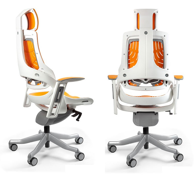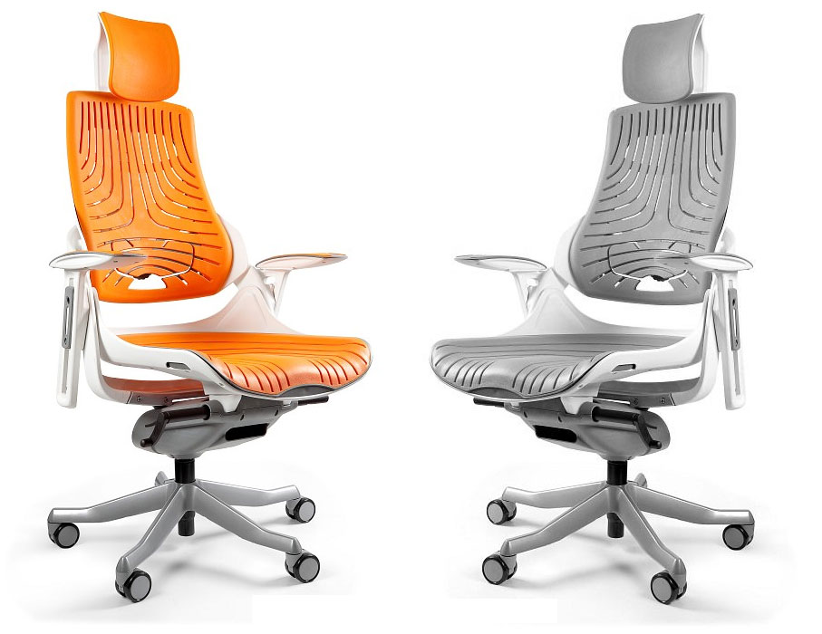 Zagłówek, oparcie i siedzisko wykonane z elastomeru (miękkie tworzywo o dużej sprężystości o właściwościach kauczuku) w kolorach szarym bądź pomarańczowym.