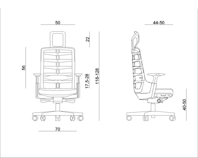 Siedzisko - konstrukcja wykonana z czarnego polipropylenu. Siedzisko pokryte formowaną pianką poliuretanową tapicerowane tkaniną materiałową (18 kolorów) lub skórą naturalną (3 kolory). Regulacja wysokości w zakresie 100 mm, regulacja głębokości w zakresie 60 mm.