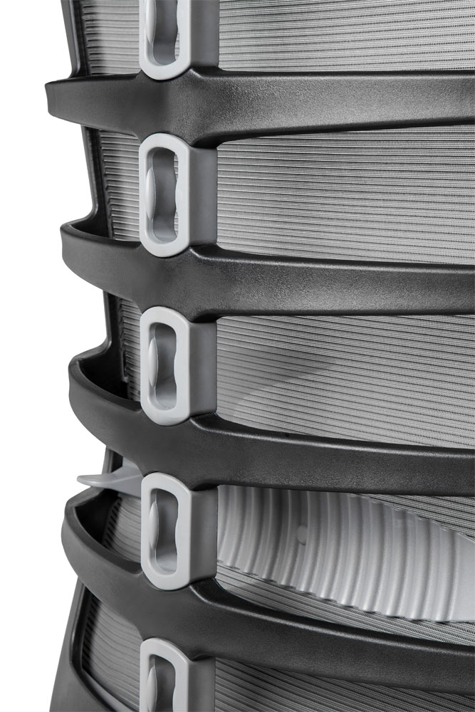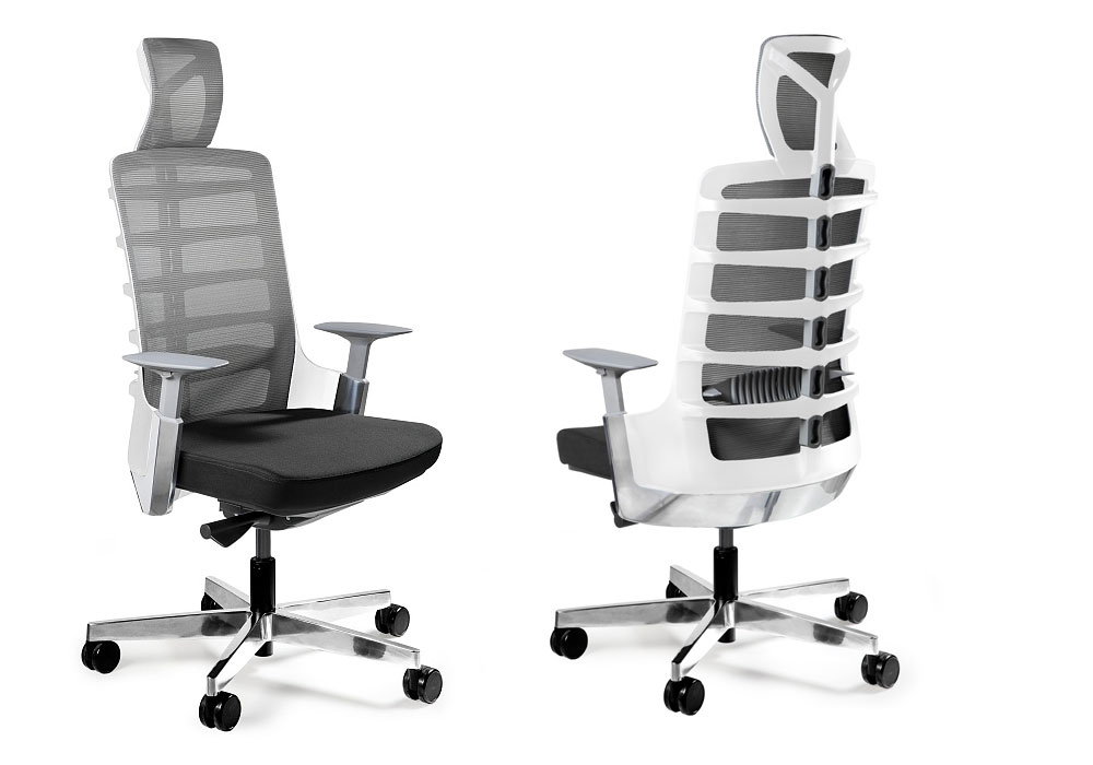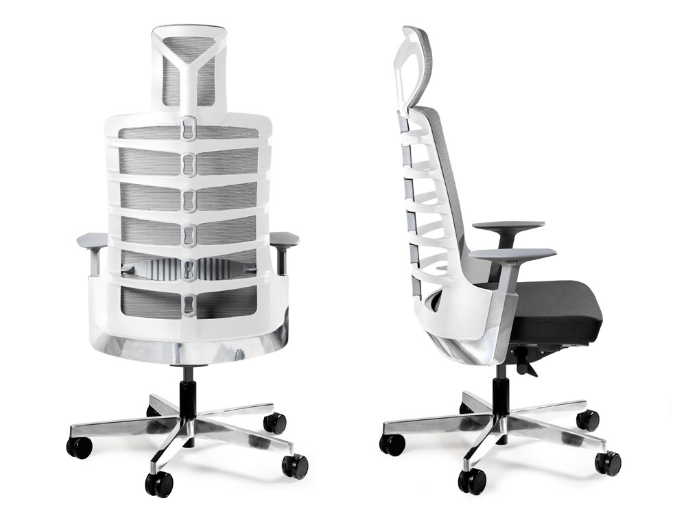 Oparcie wykonane z tworzywa polipropylenowego w kolorze białym lub czarnym. Łączenie imitujące kręgi wykonane jest z termoplastycznego elastomeru w kolorze szarym. Siatka na oparciu w kolorze szarym.