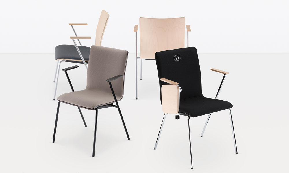 - Krzesło ze zintegrowanymi podłokietnikami, drewniane lub laminowane nakładki podłokietników.